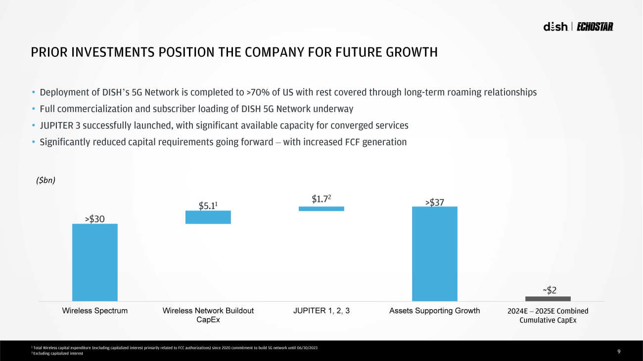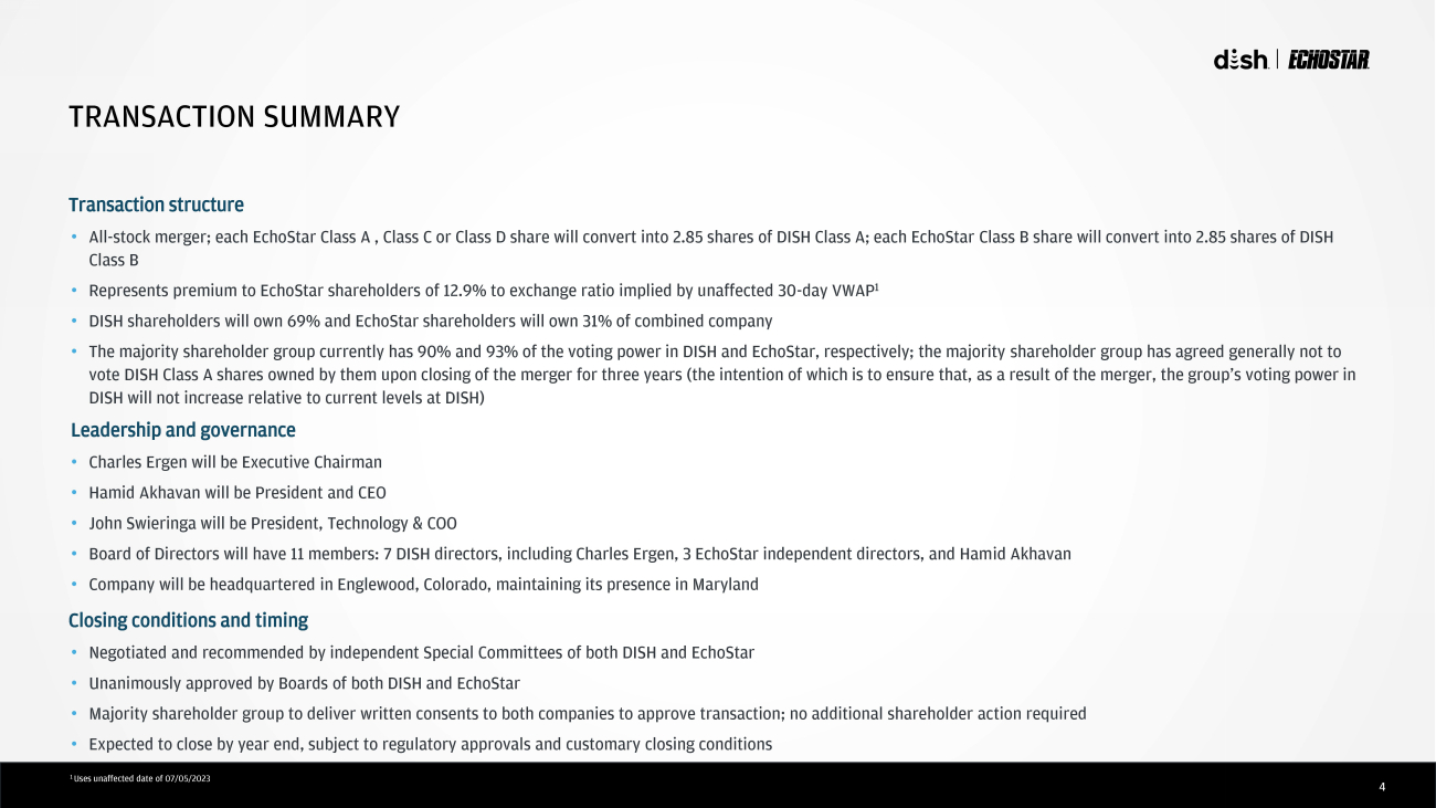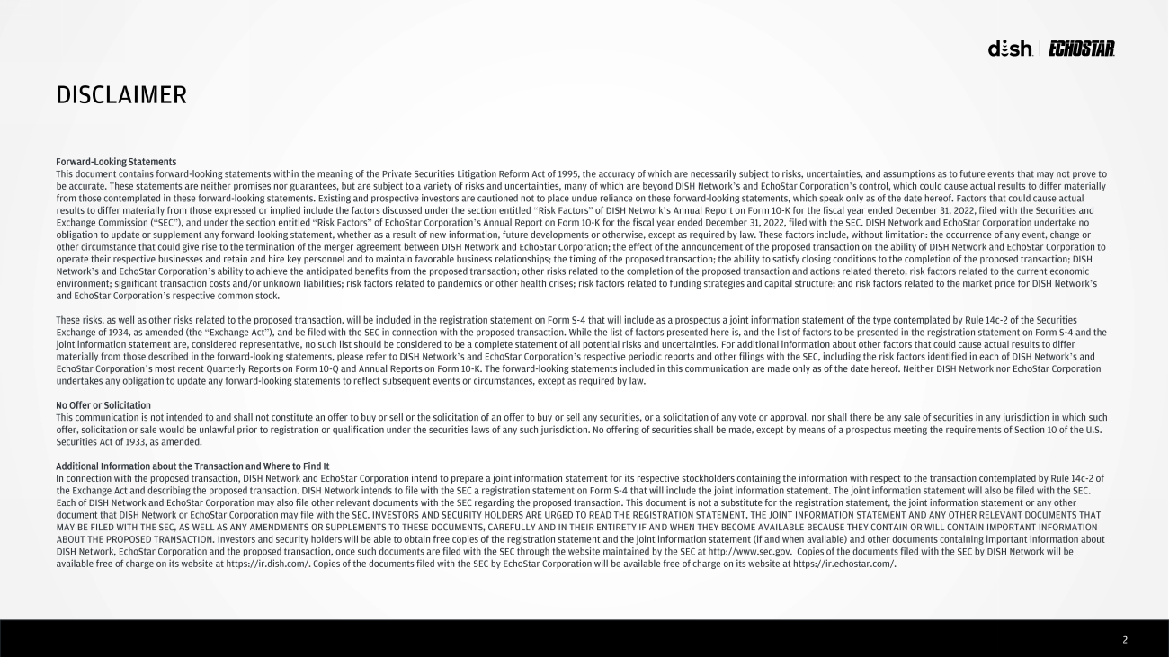 2 DISCLAIMER Forward - Looking Statements This document contains forward - looking statements within the meaning of the Private Securities Litigation Reform Act of 1995, th e accuracy of which are necessarily subject to risks, uncertainties, and assumptions as to future events that may not prove t o be accurate. These statements are neither promises nor guarantees, but are subject to a variety of risks and uncertainties, m any of which are beyond DISH Network ’ s and EchoStar Corporation ’ s control, which could cause actual results to differ materially from those contemplated in these forward - looking statements. Existing and prospective investors are cautioned not to place undue reliance on these forward - looking statements, which speak only as of the date hereof. Factors that could cause actual results to differ materially from those expressed or implied include the factors discussed under the section entitled “ Risk Factors ” of DISH Network ’ s Annual Report on Form 10 - K for the fiscal year ended December 31, 2022, filed with the Securities and Exchange Commission ( “ SEC ” ), and under the section entitled “ Risk Factors ” of EchoStar Corporation ’ s Annual Report on Form 10 - K for the fiscal year ended December 31, 2022, filed with the SEC. DISH Network and EchoStar Corporat ion undertake no obligation to update or supplement any forward - looking statement, whether as a result of new information, future developments or otherwise, except as required by law. These factors include, without limitation: the occurrence of any event, change or other circumstance that could give rise to the termination of the merger agreement between DISH Network and EchoStar Corporat ion ; the effect of the announcement of the proposed transaction on the ability of DISH Network and EchoStar Corporation to operate their respective businesses and retain and hire key personnel and to maintain favorable business relationships; the t imi ng of the proposed transaction; the ability to satisfy closing conditions to the completion of the proposed transaction; DISH Network ’ s and EchoStar Corporation ’ s ability to achieve the anticipated benefits from the proposed transaction; other risks related to the completion of the pro pos ed transaction and actions related thereto; risk factors related to the current economic environment; significant transaction costs and/or unknown liabilities; risk factors related to pandemics or other health cris es; risk factors related to funding strategies and capital structure; and risk factors related to the market price for DISH Netwo rk ’ s and EchoStar Corporation ’ s respective common stock. These risks, as well as other risks related to the proposed transaction, will be included in the registration statement on Fo rm S - 4 that will include as a prospectus a joint information statement of the type contemplated by Rule 14c - 2 of the Securities Exchange of 1934, as amended (the “ Exchange Act ” ), and be filed with the SEC in connection with the proposed transaction. While the list of factors presented here is, and th e l ist of factors to be presented in the registration statement on Form S - 4 and the joint information statement are, considered representative, no such list should be considered to be a complete statement of a ll potential risks and uncertainties. For additional information about other factors that could cause actual results to differ materially from those described in the forward - looking statements, please refer to DISH Network ’ s and EchoStar Corporation ’ s respective periodic reports and other filings with the SEC, including the risk factors identified in each of DISH Network ’ s and EchoStar Corporation ’ s most recent Quarterly Reports on Form 10 - Q and Annual Reports on Form 10 - K. The forward - looking statements included in this co mmunication are made only as of the date hereof. Neither DISH Network nor EchoStar Corporation undertakes any obligation to update any forward - looking statements to reflect subsequent events or circumstances, except as requ ired by law. No Offer or Solicitation This communication is not intended to and shall not constitute an offer to buy or sell or the solicitation of an offer to buy or sell any securities, or a solicitation of any vote or approval, nor shall there be any sale of securities in any jurisdiction i n which such offer, solicitation or sale would be unlawful prior to registration or qualification under the securities laws of any such ju ris diction. No offering of securities shall be made, except by means of a prospectus meeting the requirements of Section 10 of t he U.S. Securities Act of 1933, as amended. Additional Information about the Transaction and Where to Find It In connection with the proposed transaction, DISH Network and EchoStar Corporation intend to prepare a joint information stat eme nt for its respective stockholders containing the information with respect to the transaction contemplated by Rule 14c - 2 of the Exchange Act and describing the proposed transaction. DISH Network intends to file with the SEC a registration statement on Form S - 4 that will include the joint information statement. The joint information statement will also be filed with the SEC. Each of DISH Network and EchoStar Corporation may also file other relevant documents with the SEC regarding the proposed tran sac tion. This document is not a substitute for the registration statement, the joint information statement or any other document that DISH Network or EchoStar Corporation may file with the SEC. INVESTORS AND SECURITY HOLDERS ARE URGED TO READ TH E R EGISTRATION STATEMENT, THE JOINT INFORMATION STATEMENT AND ANY OTHER RELEVANT DOCUMENTS THAT MAY BE FILED WITH THE SEC, AS WELL AS ANY AMENDMENTS OR SUPPLEMENTS TO THESE DOCUMENTS, CAREFULLY AND IN THEIR ENTIRETY IF AN D W HEN THEY BECOME AVAILABLE BECAUSE THEY CONTAIN OR WILL CONTAIN IMPORTANT INFORMATION ABOUT THE PRO