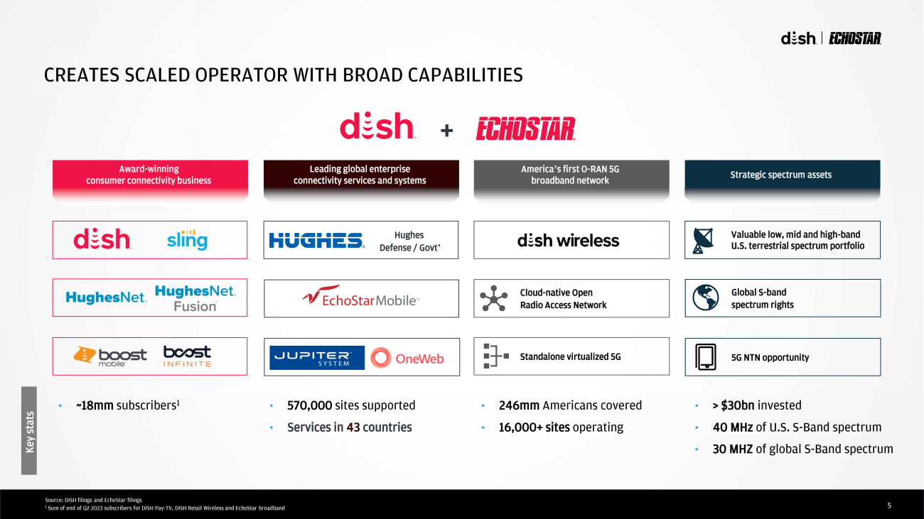 4 TRANSACTION SUMMARY Transaction structure • All - stock merger; each EchoStar Class A , Class C or Class D share will convert into 2.85 shares of DISH Class A; each EchoStar Class B share will convert into 2.85 shares of DISH Class B • Represents premium to EchoStar shareholders of 12.9% to exchange ratio implied by unaffected 30 - day VWAP 1 • DISH shareholders will own 69% and EchoStar shareholders will own 31% of combined company • The majority shareholder group currently has 90% and 93% of the voting power in DISH and EchoStar, respectively; the majority sh areholder group has agreed generally not to vote DISH Class A shares owned by them upon closing of the merger for three years (the intention of which is to ensure that, as a result of the merger, the group's voting power in DISH will not increase relative to current levels at DISH) Leadership and governance • Charles Ergen will be Executive Chairman • Hamid Akhavan will be President and CEO • John Swieringa will be President, Technology & COO • Board of Directors will have 11 members: 7 DISH directors, including Charles Ergen, 3 EchoStar independent directors, and Ham id Akhavan • Company will be headquartered in Englewood, Colorado, maintaining its presence in Maryland Closing conditions and timing • Negotiated and recommended by independent Special Committees of both DISH and EchoStar • Unanimously approved by Boards of both DISH and EchoStar • Majority shareholder group to deliver written consents to both companies to approve transaction; no additional shareholder ac tio n required • Expected to close by year end, subject to regulatory approvals and customary closing conditions 1 Uses unaffected date of 07/05/2023