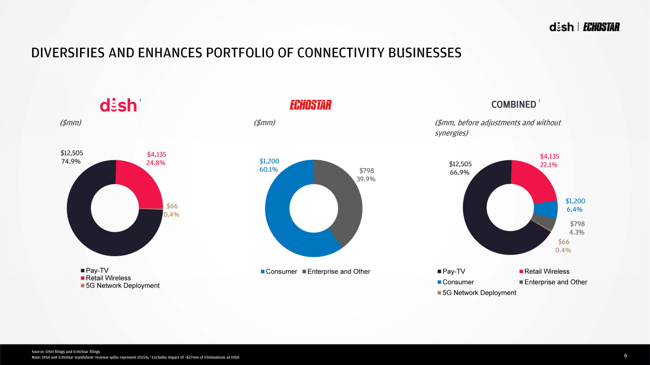 5 CREATES SCALED OPERATOR WITH BROAD CAPABILITIES + Award - winning consumer connectivity business • ~18mm subscribers 1 • 570,000 sites supported • Services in 43 countries Leading global enterprise connectivity services and systems America ’ s first O - RAN 5G broadband network • 246mm Americans covered • 16,000+ sites operating Cloud - native Open Radio Access Network Standalone virtualized 5G Strategic spectrum assets Valuable low, mid and high - band U.S. terrestrial spectrum portfolio Global S - band spectrum rights • > $30bn invested • 40 MHz of U.S. S - Band spectrum • 30 MHZ of global S - Band spectrum Key stats Source: DISH filings and EchoStar filings 1 Sum of end of Q2 2023 subscribers for DISH Pay - TV , DISH Retail Wireless and EchoStar broadband Hughes Defense / Govt ’ 5G NTN opportunity