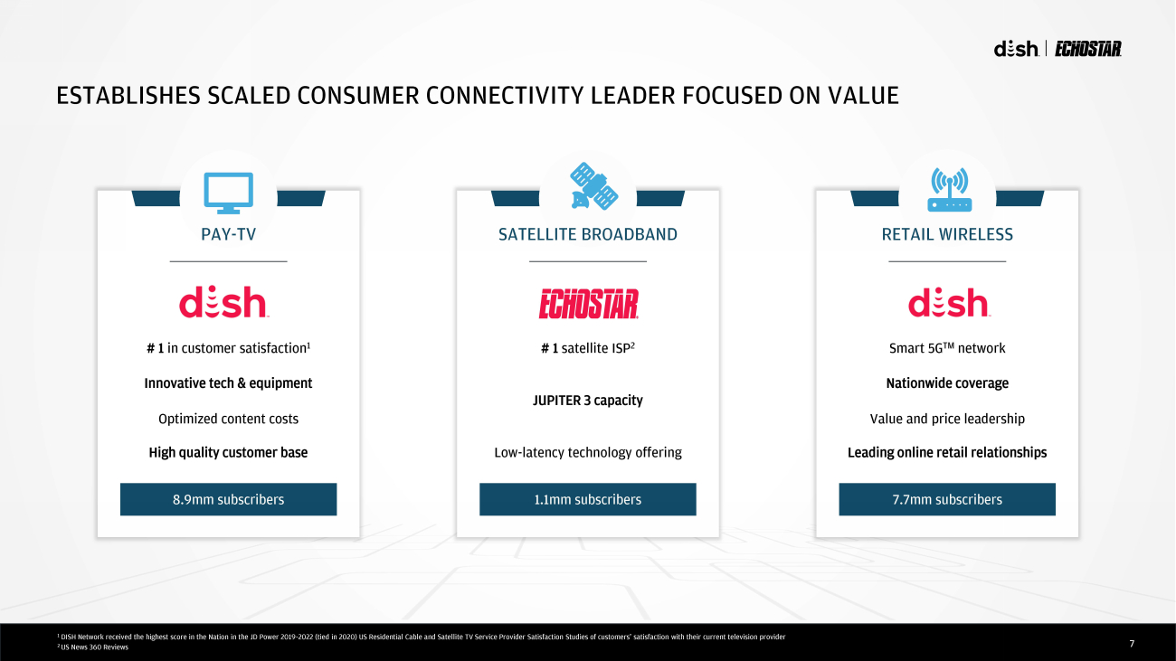 6 COMBINED $12,505 66.9% $4,135 22.1% $1,200 6.4% $798 4.3% $66 0.4% Pay-TV Retail Wireless Consumer Enterprise and Other 5G Network Deployment ($mm, before adjustments and without synergies) DIVERSIFIES AND ENHANCES PORTFOLIO OF CONNECTIVITY BUSINESSES Source: DISH filings and EchoStar filings Note: DISH and EchoStar standalone revenue splits represent 2022A; 1 Excludes impact of ~$27mm of Eliminations at DISH ($mm) $12,505 74.9% $4,135 24.8% $66 0.4% Pay-TV Retail Wireless 5G Network Deployment $1,200 60.1% $798 39.9% Consumer Enterprise and Other ($mm) 1 1