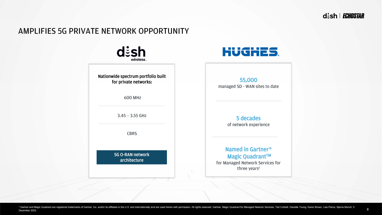 7 ESTABLISHES SCALED CONSUMER CONNECTIVITY LEADER FOCUSED ON VALUE # 1 in customer satisfaction 1 Innovative tech & equipment Optimized content costs High quality customer base 8.9mm subscribers # 1 satellite ISP 2 JUPITER 3 capacity Low - latency technology offering 1.1mm subscribers Smart 5G TM network Nationwide coverage Value and price leadership Leading online retail relationships 7.7mm subscribers PAY - TV SATELLITE BROADBAND RETAIL WIRELESS 1 DISH Network received the highest score in the Nation in the JD Power 2019 - 2022 (tied in 2020) US Residential Cable and Satelli te TV Service Provider Satisfaction Studies of customers' satisfaction with their current television provider 2 US News 360 Reviews