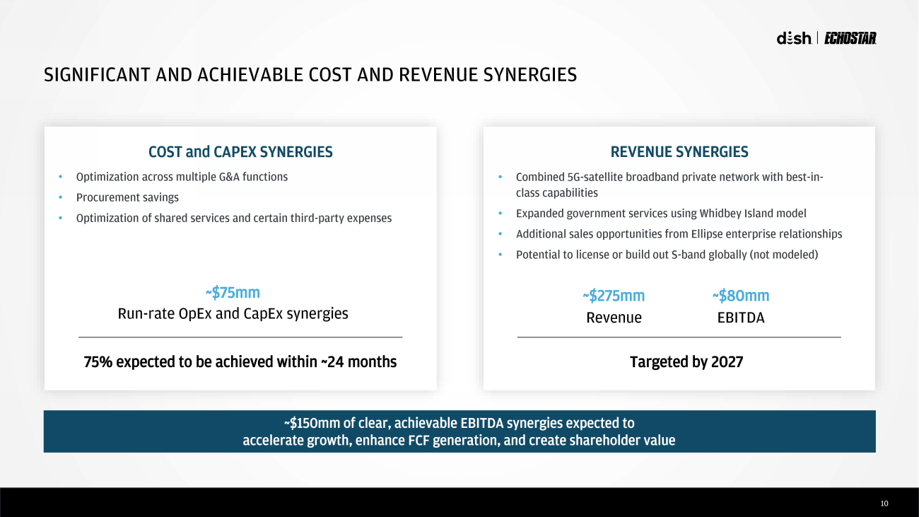 9 PRIOR INVESTMENTS POSITION THE COMPANY FOR FUTURE GROWTH • Deployment of DISH ’ s 5G Network is completed to >70% of US with rest covered through long - term roaming relationships • Full commercialization and subscriber loading of DISH 5G Network underway • JUPITER 3 successfully launched, with significant available capacity for converged services • Significantly reduced capital requirements going forward – with increased FCF generation >$30 $5.1 1 $1.7 2 >$37 ~$2 Wireless Spectrum Wireless Network Buildout CapEx JUPITER 1, 2, 3 Assets Supporting Growth 2024E – 2025E Combined Cumulative CapEx 1 Total Wireless capital expenditure (excluding capitalized interest primarily related to FCC authorizations) since 2020 commit me nt to build 5G network until 06/30/2023 2 Excluding capitalized interest ($bn)