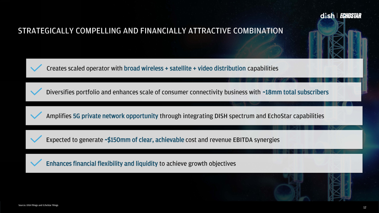 3 STRATEGICALLY COMPELLING AND FINANCIALLY ATTRACTIVE COMBINATION Source: DISH filings and EchoStar filings Enhances financial flexibility and liquidity to achieve growth objectives Expected to generate ~$150mm of clear, achievable cost and revenue EBITDA synergies Creates scaled operator with broad wireless + satellite + video distribution capabilities Amplifies 5G private network opportunity through integrating DISH spectrum and EchoStar capabilities Diversifies portfolio and enhances scale of consumer connectivity business with ~18mm total subscribers